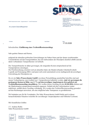 Aufgrund der aktuell gestiegenen Treibstoffkosten werden wir ab dem 01.04.2026 ein Treibstoffkostenzuschlag für alle frei gelieferten Anlieferungen erheben.
